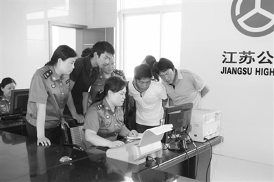 日前,西藏自治区拉萨市交通局派遣林周、达孜、当雄3个县交通局的3名干部,来邮进行为期一个月的农村公路养护业务培训。图为拉萨客人在高邮超限检测站参观学习江苏省路政管理系统执法、许可子系统操作应用。 张荣春 玉梅 摄