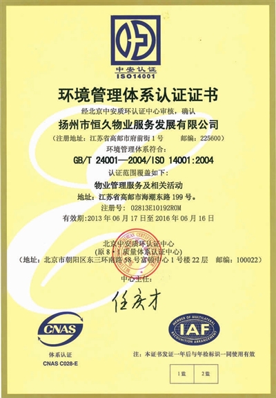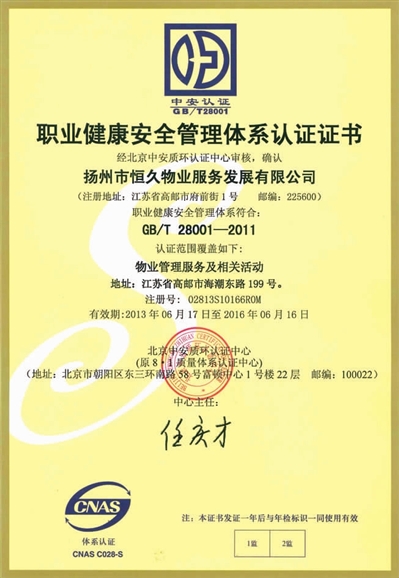 扬州市恒久物业服务发展有限公司通过近几年的发展,本着内强素质,外树品质管理理念,在企业管理中形成了一整套的管理体制,为公司做大做强奠定了良好的内部管理基础。今年四月份公司通过北京中安质环认证中心审核,并在六月份顺利取得环境管理体系认证及职业健康安全管理体系认证证书。