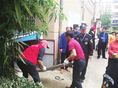 8日上午,南海社区会同公安、城管部门以及社区网格长、志愿者等,对辖区内小区居民楼旁的违建杂物间、违建防盗门等进行依法拆除,并及时完成建筑垃圾的清运工作。图为整治现场。 东方 摄