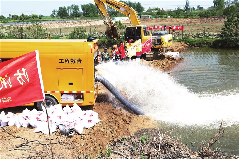 近日,市水利综合服务中心联合市中小河流治理工程建设处举办“高邮市天菱河整治工程”防汛抢险应急演练。活动共组织抢险人员50余人,出动应急车辆2台,救援机械2台,新型应急装备2套,模拟了从雨水倒灌险情开始至处理结束的应急救援全过程,提升了工程参建人员的防汛抢险应急处置能力。图为演练现场。