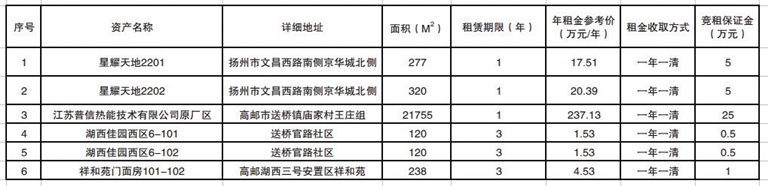 经有关部门批准,扬州科丰高新产业投资开发集团有限公司定于2023年5月9日上午9:00 在扬州市公共资源交易中心高邮分中心网站对以下房产进行网上公开招租:
