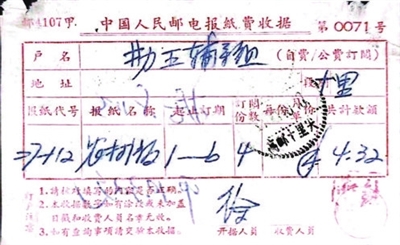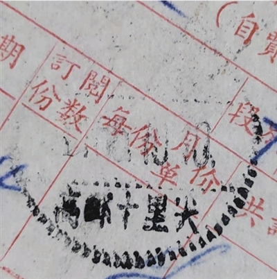 上图为邮友刘宏钢提供的盖有“江苏/高邮十里尖”点线式邮戳的报刊订阅收据。