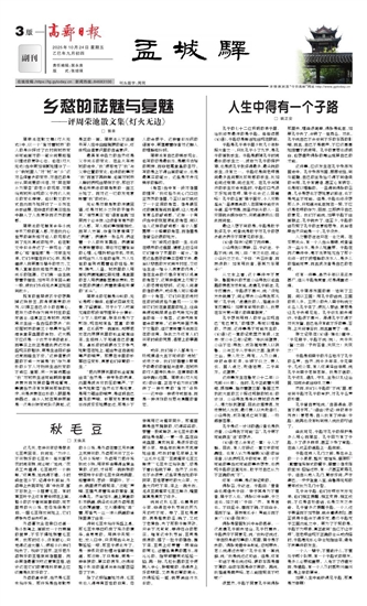 除了这般隆重地对待,毛豆米也入得寻常百姓的日常。母亲常用它与雪菜同炒。那雪里蕻是自家腌制的,切得碎碎的,带着一股咸鲜劲,与毛豆米的清甜恰是绝配;一青一绿,盛在白瓷盘里,清爽悦目,是很好的佐粥小菜。早些年我常去苏杭等地出差,吃饭时看见菜单上有“丝瓜炒毛豆”“豆腐雪菜毛豆三鲜煲”“毛豆米红烧杂鱼”,总是不看价格就下单。当然了,价钱也不会很贵,这些菜是当地的平民菜,百姓愿意吃的大众菜。大鱼大肉吃下来,来上一碗米饭,泡点豆腐雪菜毛豆三鲜汤,嘴里面真是清爽了许多。