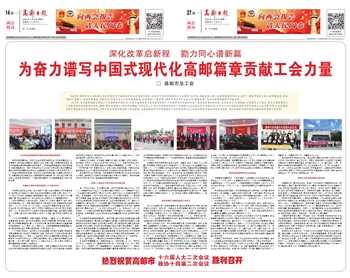 2022年,高邮市总工会坚持以习近平新时代中国特色社会主义思想为指引,认真学习宣传贯彻党的二十大精神,在市委、市政府和上级工会的坚强领导和关心支持下,围绕市委和上级工会部署要求,紧扣“聚焦江苏绿心、加快中部崛起”目标定位,深化产业工人队伍建设改革,扎实推进“六项行动”,团结引领全市广大职工在“强富美高” 现代化新高邮建设中贡献力量。