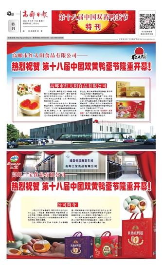 公司引进日本先进生产线,甄选新鲜鸭蛋为原料,采用传统工艺和现代技术加工生产,“红太阳”牌高邮咸鸭蛋蛋白鲜、细、嫩,蛋黄红、沙、油。在华东市场占有率居行业前列,2011年成立电子商务部,红太阳食品旗舰店是同行首家入驻天猫的企业,通过电商赋能蛋品销售,带动同行企业共同做大高邮鸭蛋产业。