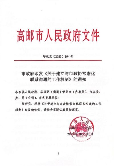 市政府印发《关于建立与市政协常态化联系沟通的工作机制》。