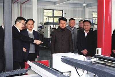 党委书记冯长征,党委副书记、镇长钱向前现场观摩汇鸿中鼎鞋类研发中心生产线运行情况