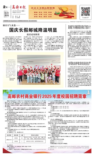4.了解更多招聘讯息及相关动态,敬请关注“江苏辖区农商银行招聘”、“江苏高邮农村商业银行”微信公众号。