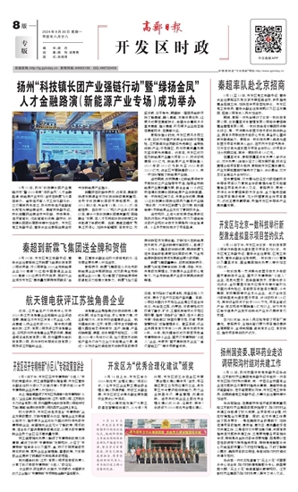 秦超作推介时说,开发区栉风沐雨三十年,已成为中国产学研合作创新示范基地、江苏制造突出贡献奖先进单位、省特色创新(产业)示范园区、扬州市高质量发展攻坚突破先进集体。近年来,开发区成功招引新能源产业重大项目20个,投资总规模超400亿元,新能源产业开票销售从2017年的28.3亿元跃升至2023年的321.5亿元,占全区开票销售的51.8 %,进一步加长增粗了新能源产业链。