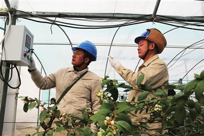 14日,市供电公司卸甲供电所员工前往位于该镇金港村的蓝莓大棚种植基地,帮助维护用电设施,保障温室大棚通风、滴灌等设备安全可靠用电 。图为活动现场。
