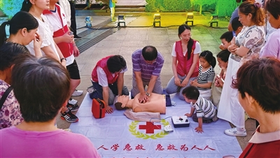 夏日炎炎,杏林志愿者们先后走进世贸广场、净土寺塔广场、蝶园广场、吾悦广场等地,开展心肺复苏培训活动,旨在进一步提升人民群众的急救能力。图为培训现场。