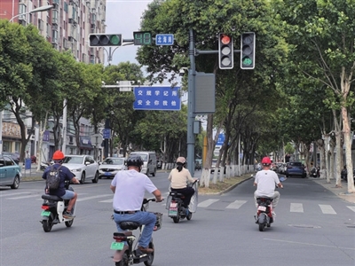 整改前,蝶园岗电动自行车驾驶人员未佩戴安全头盔且闯红灯