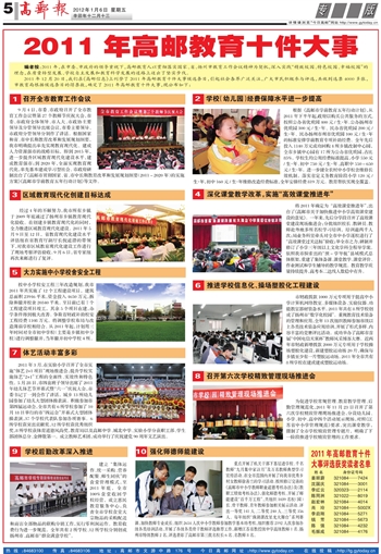 2011年12月20日,我们在《高邮信息》上刊登了候选条目,引起社会各界广泛关注,广大市民积极参与评选,共收到选票4000多张,市教育局根据候选条目的得票数,确定了2011年高邮教育十件大事,现公布如下: