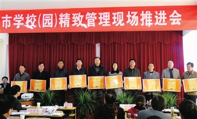 为促进学校常规管理、教育教学管理、后勤管理规范化,2011年11月23日召开了第六次学校精致管理现场推进会,分设幼儿园、小学、初中、高中四个活动展示现场,对照《江苏省中小学管理规范》要求,突出课堂教学,摄制了全市学校精致管理专题片,明确了下一阶段推进学校精致管理的工作要求。