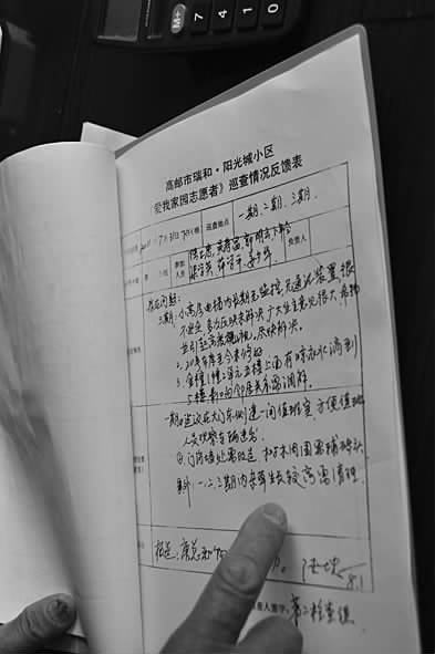 去年,“爱我家园志愿者”还制定了巡查情况反馈表,将平时在小区巡查时看到的问题记录下来,及时反馈给业委会,由业委会向物业公司提出修改意见。“为业主当家作主,为物业做好参谋;为业主排忧解难,为物业沟通业主;为业主办事尽心,为物业维护职权;为业主无私奉献,为物业和谐共处。”挂在业委会墙上的几句话,诠释了业委会和“爱我家园志愿者”队伍的服务理念。