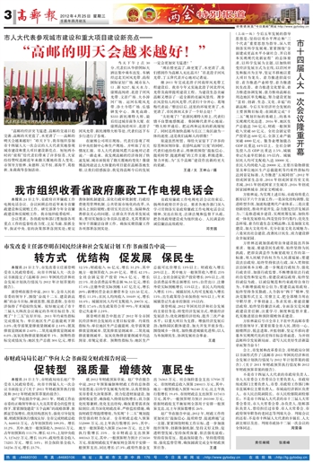 赵广华在报告中说,2011年,财政工作在市委的正确领导和市人大及其常委会的监督支持下,紧紧围绕建设“五个高邮”的战略部署,狠抓征管保增长,优化结构惠民生,强化引导促发展,财政预算执行情况良好。全市完成财政总收入460018万元,占年初预算的109.3%,增长31.2%。其中:地方一般预算收入204855万元,占年初预算的113.7%,增长42.1%;上划中央收入127622万元,增长18.3%;政府性基金收入73285万元,增长34%;社会保险基金收入54256万元,增长23.7%。