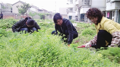 针对一些居民小区种菜毁绿反潮现象,连日来,奎楼社区以创建卫生城为契机,组织社区所有工作人员和部分居民志愿者进行突击清理。图为志愿者在蝶园新村清理杂草。