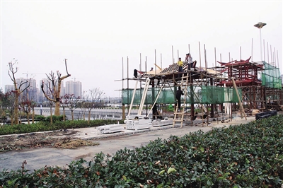 北关河风光带下月中旬将交付使用。图为施工人员正在建设四角亭。林山 摄