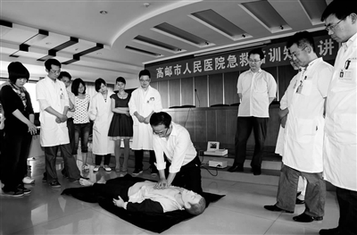 随后,急诊科副主任王毅讲解了除颤仪的应用,除颤的目的及方法,恶性心律失常心电图的识别。同时重点讲解了心肺复苏的方法及目前相关进展。心肺复苏讲解结束后,医院所有的住院、进修医师在急诊六楼会议室共同复习了在模拟人身上具体的心肺复苏操作步骤,每位医师都进行心肺复苏操作练习,同时吴卫中主任和吴玲护士长现场予以点评。