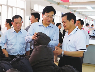 11日,安徽省铜陵市人大常委会常务副主任唐世定一行来邮参观考察。期间,唐世定一行对我市项目建设、城市面貌以及干部群众的精神状态等给予高度赞扬。市领导丁一、金春林、汤学仁、郭海平、葛桂秋等陪同考察。图为唐世定一行在波司登公司考察的场景。杨星 王林山 文/摄