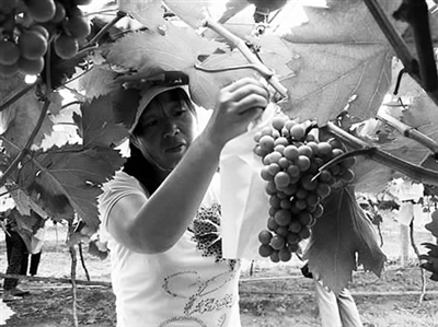 今年37岁的八桥镇陈堡村“外来妹”廉爱红,在家人支持下投资100多万元,用三年多时间创办了占地100多亩的兆全葡萄种植园,并牵头成立葡萄合作社,引领当地20多名村民同走葡萄种植致富路。图为廉爱红与合作社成员一道为即将成熟的葡萄逐一套装纸质防护袋。 吴继原