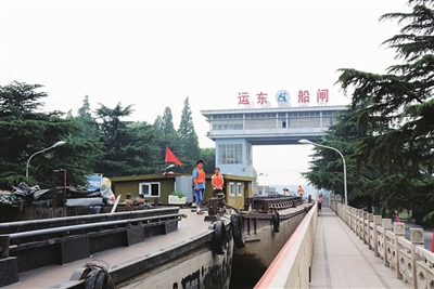 近日记者在运东船闸采访时看到,排队过闸的船舶为数众多。为缓解船舶过闸压力,运东船闸狠抓现场管理,实行科学调度,以确保待闸船舶安全、快速通航。图为运东船闸工作人员引导船只过闸的场景。 王林山 摄