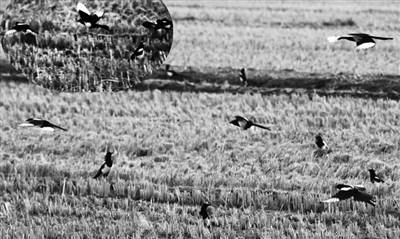 14日下午,记者在高邮镇湖滨一带已收割完的稻田里看见数百只喜鹊在此觅食嬉戏。一位八十多岁的老农表示,长这么大第一次见到这么多喜鹊集聚在一起。王林山 摄