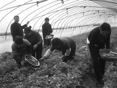 图为农场工人在摘草莓。