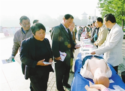 昨日清晨,市政府办公室、市应急管理办公室在蝶园广场举行《高邮市民应急手册》首发式活动。市委常委、常务副市长徐永宝出席活动,并向参加活动的部门单位和社区、学校发放《高邮市民应急手册》。图为参加首发式的部门单位向群众发放应急知识宣传资料。乔杰 林山 摄影报道