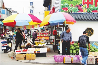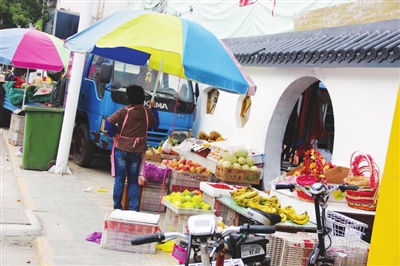 市河周边占道经营现象严重,市民反映强烈。记者在走访中看到,尽管相关部门在市河南侧专门设立了摊位疏导点,但不少摊主还是出摊占道经营。有的摊主甚至将疏导点的墙体自行打了个圆门,便于出摊经营。为何好好的“疏导点”不进,非要出摊经营呢?在采访中,一位经营水果的摊主说,进“疏导点”经营没有消费者进去,影响生意,再说人家能出来经营,我也能出来经营。那位自行“开门”的摊主则说,摊位放在“疏导点”的里面,北面又没有门进出,有谁特意跑进来买水果呀!因生意不好,每天都要烂掉一些水果,实在没办法才打洞开门的。记者看到,“疏导点”里的摊主几乎都在门外占有一席地盘。现场城管执法人员无奈地说,现在管理很难,强行取缔更难,只有说服摊主占道经营不要太“过份”。记者看到,“疏导点”两侧占道经营现象十分严重,几乎将道路堵塞……