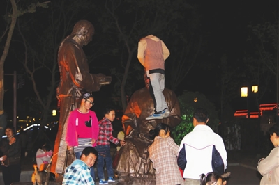 记者在市河中段的人物雕像前看到,许多大人纵容小孩攀爬到雕像上拍照、玩耍,既不安全又可能会对雕像产生损坏,更影响城市的文明形象。记者还看到,有些市民在出游的过程中,随意向地面和河中丢扔杂物,有的男性市民还躲进民居的巷道中随地小便。