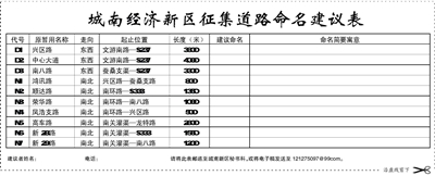 五、其他事项。征集日期截至2014年6月15日。咨询联系人:仇女士,电话:15252509636。《城南经济新区征集道路命名建议表》在6月9日《高邮日报》或《在http://www.gyjjxq.gov.cn/(公告公示栏)下载,表格填好后邮递至高邮城南经济新区秘书科收,或电子稿发送至121275097@qq.com。