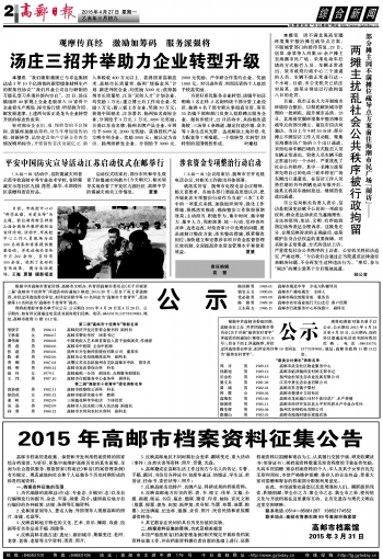 现将拟表彰对象名单予以公示,公示期自2015年4月24日至4月28日。公示期内,如有异议请通过电话或书面向我们反映。电话:84615170,13773319081,地址:高邮市政府11楼1112室。