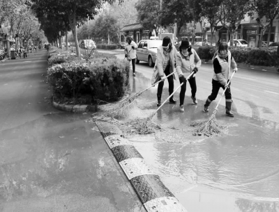 连日来,市环卫处工人冒着严寒及时清扫路面落叶和生活垃圾,为“四城同创”尽心尽力。