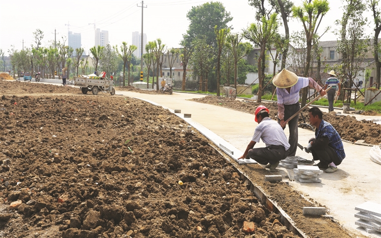 老横泾河北岸的“滨河公园”项目已完成园路铺设60%,停车场已完工。目前施工人员正在对庄台路基进行面层施工和绿化完善。图为施工人员在北岸景区带施工的场景。 王林山 摄
