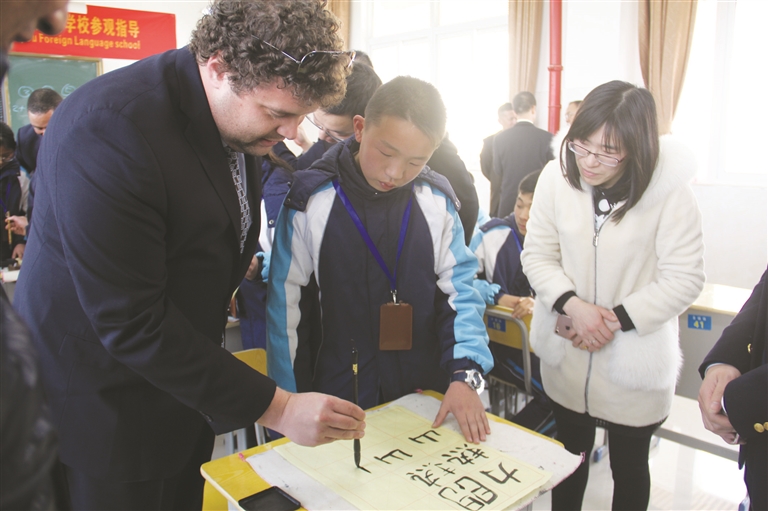 3月27日,美国路易斯安那州代表团一行8人到开发区外国语学校参观访问,了解该校教学情况,并与师生们进行了互动交流。图为交流活动现场。