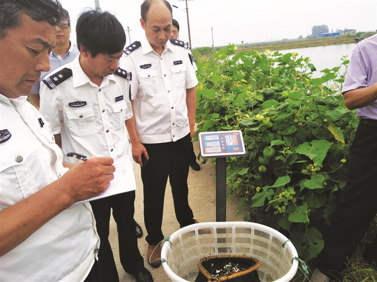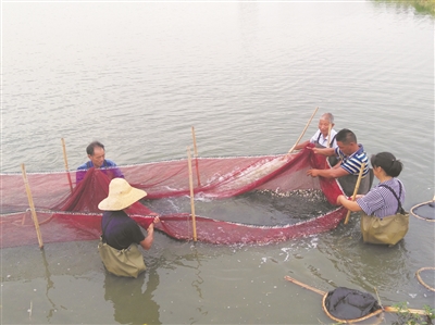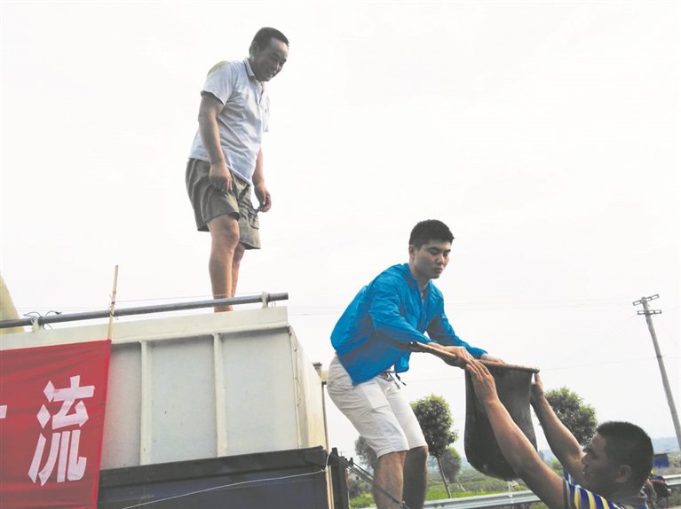 上午7时许,渔政执法管理人员来到位于甘垛镇北部的董氏特种水产有限公司调运鱼苗。虽说是早晨,但天气还是非常闷热。池塘里,工人们早将鱼苗用渔网拉拢在一起,并不时地泼洒塘水。董氏特水公司负责人告诉记者:“由于气温太高,鱼苗不能折腾。为了保证放流成活率,公司前一天晚上就做好了有关起捕准备工作,一大早就把鱼苗聚拢在了一起,所以调运车辆一到,就能迅速装运。”