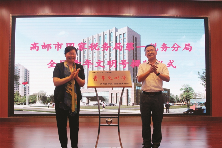 郭鹏驰书记和杨洁局长共同为“2015—2016年度全国青年文明号”获奖单位高邮市国家税务局第一税务分局揭牌。郭鹏驰对扬州国税系统“青年文明号”创建工作给予了充分的肯定,对市国税局下一步创建工作提出了明确的要求。他希望国税系统“青年文明号”集体要积极参与“开放周活动”,以“青春建功十三五”为统揽,以喜迎党的十九大为主线,加强活动统筹推进,努力把内容做实、形式搞活、平台拓广,不断展示出扬州国税发展的新气象,汇聚税务青年创新创造的正能量;同时要将“青年文明号”争创工作融入深化改革的工作大局,把创建活动嵌入国税行业的改革创新、延伸到“营改增”等重点工作的主战场,激发广大团员青年岗位创优的动力,发挥“青年文明号”的示范带头作用;最后,他希望国税系统要与各级团组织保持紧密联系,加强协同合作,通过联创共建强化社会评价,不断提升“青年文明号”品牌的社会影响力,以实际行动迎接党的十九大胜利召开!