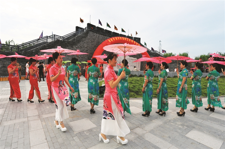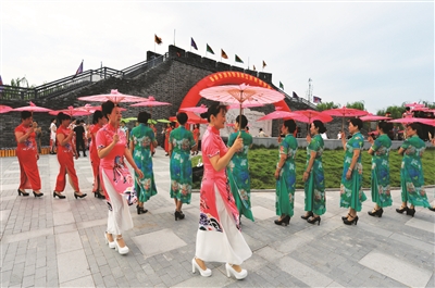 日前,高邮市旗袍协会成立典礼在北门瓮城遗址公园举行。图为典礼现场“旗袍秀”。 王林山 摄