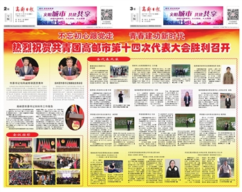 热烈庆祝共青团高邮市第十四次代表大会顺利召开!在中国特色社会主义进入新时代的时间节点,还沉浸在学习党的十九大精神氛围中,又逢青春盛会,“青年一代有理想、有本领、有担当,国家就有前途,民族就有希望”体会更深刻。在新一届共青团高邮市委员会的引领下,我们不忘初心高举团旗跟党走,青春建功新时代!