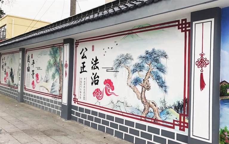 连日来,金桥路与花湾路十字路口处出现的一组文化墙绘,吸引了不少市民驻足欣赏。记者在现场看到,墙绘面积约150平方米,内容有社会主义核心价值观宣传,也有高邮城市地标建筑展示。这些文化墙绘既美化了城区环境,又为文明城市创建增添了一抹亮丽色彩。图为墙绘一景。