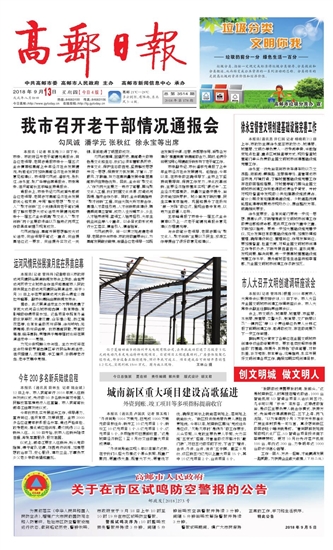高邮报 一版要闻 01 2018-09-131 2018年09月13日 星期四