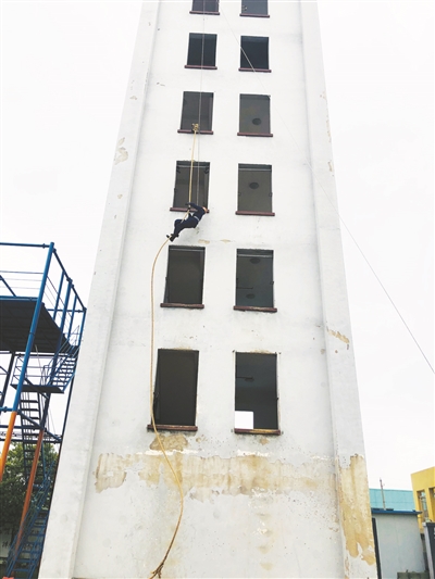 梅林彬告诉记者,每天天边刚泛起白光,消防队员就开始操练起来。体力和速度对于救援而言至关重要,为此,队员们每天的训练时间都在8小时以上。背负空气呼吸器5000米跑、400米救人疏散物资、100米负重跑、绳索攀爬等,是中队的每天必练项目。除了在队里训练外,大家还经常到自己所负责辖区内熟悉安全通道、消防栓的位置,以及辖区内的水源道路等。