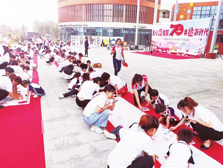 国庆节即将来临。连日来,各地、各部门单位纷纷组织开展系列庆祝国庆活动,营造浓烈的喜庆氛围,激发大家热爱祖国、热爱家乡、热爱美好生活的情感。图为25日上午送桥镇举办的“童心颂祖国,共绘新时代”百米长卷绘画活动场景。