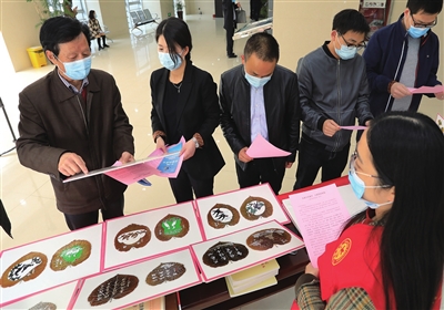 22日,市生态环境局退休人员陈立平在商业大厦一楼举办个人树叶画展。近几年来,陈立平利用银杏树叶和山麻杆叶,进行书法和绘画创作,突出宣传环境保护,目前作品已有近千张。图为陈立平(左一)向过往群众介绍作品。 王林山 摄