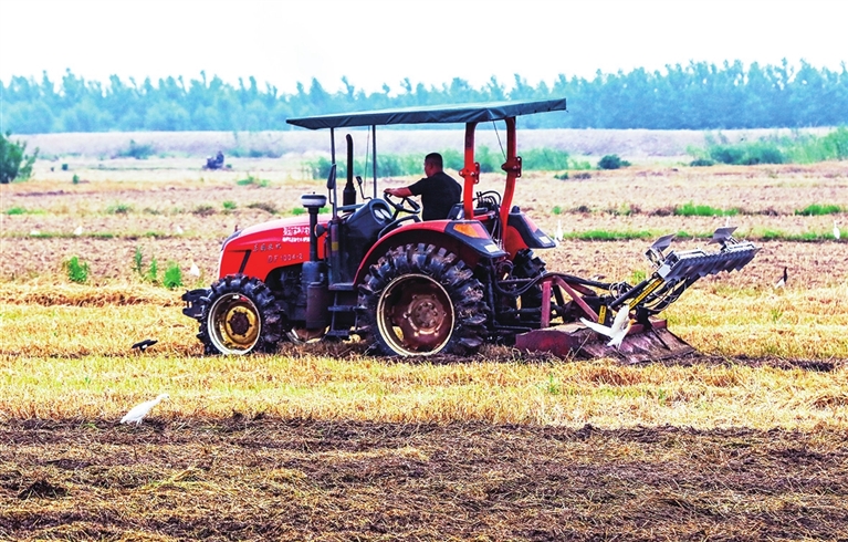 图为送桥镇农机手正在对已收割完的麦田进行翻耕,其间还有不少鸟儿在觅食,好一派人勤鸟鸣机欢唱的和谐画面! 王林山摄