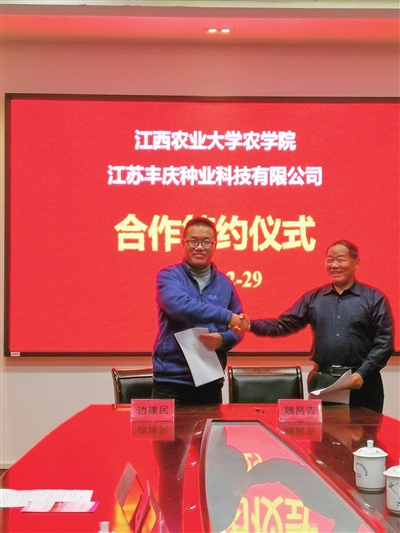 2020年12月29日下午,江苏丰庆种业公司负责人一行前往江西农业大学,拜会农学院方加海等专家教授,就种业研发进行深入讨论交流。江西农大农学院和丰庆种业公司一致同意,就水稻新品种研发、种质资源交流、重点技术攻关、产业化支持、人才培养和人才项目申报等方面开展合作。 丰庆 宣