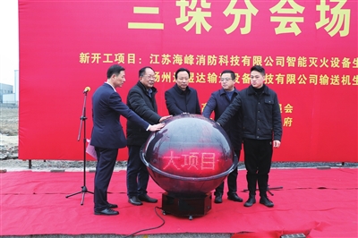 3月1日上午,三垛镇举行一季度重大项目建设“开门红”集中开工仪式,此次集中开工项目共2个,分别是总投资2亿元的江苏海峰消防智能灭火设备生产项目、总投资0.5亿元的扬州通煜达输送机生产项目。高邮市人大常委会副主任吴惠山出席集中开工仪式,全体镇干、市、镇属部门单位副职以上人员、各村(社区)副村级以上人员,规上企业负责人参加活动。