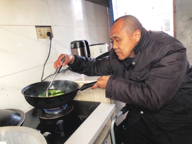 20多年来,在政府一系列政策帮扶下,朱荣余家的生活有了很大改善,去年摘下了“穷”帽子,今年残疾人无障碍设施改造又为他的生活提供了方便。“最困难、最难熬的日子已经过去了,家里脱贫了,日常生活能自己解决,以后日子肯定会越来越好。”说着,朱荣余将记者引进他家的厨房。10多平方米的厨房粉刷一新,十分亮堂,原来的土灶大锅已“下岗”,取而代之的是崭新的橱柜、升降灶台、热水器、燃气灶等。轮椅上的朱荣余拿起遥控器,按住下降键,灶台自动下降,打火、倒油,放入洗好的青菜。不一会儿,一盘炒青菜做好了。“以前使用的是老式灶台,坐在轮椅上够不着,自己做不了饭。这个升降灶台,可以根据人的身高调升降,这样一来我不但能够解决自己的吃饭问题,在爱人下班回家前,还能为她做好一口热饭菜。” 朱荣余感言,厨房里的所有新设施,都是今年政府免费为自己量身定制的,有了这些无障碍设施的助力,自己生活有了大突破,吃喝不再需要妻子照顾,平时还能做些力所能及的家务活。妻子也找到了一份工作,家里有了稳定的收入。