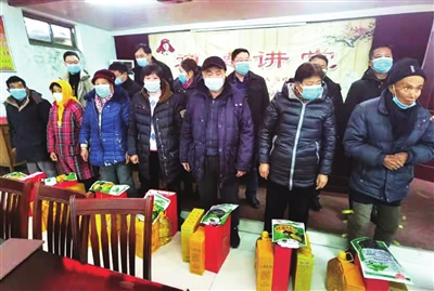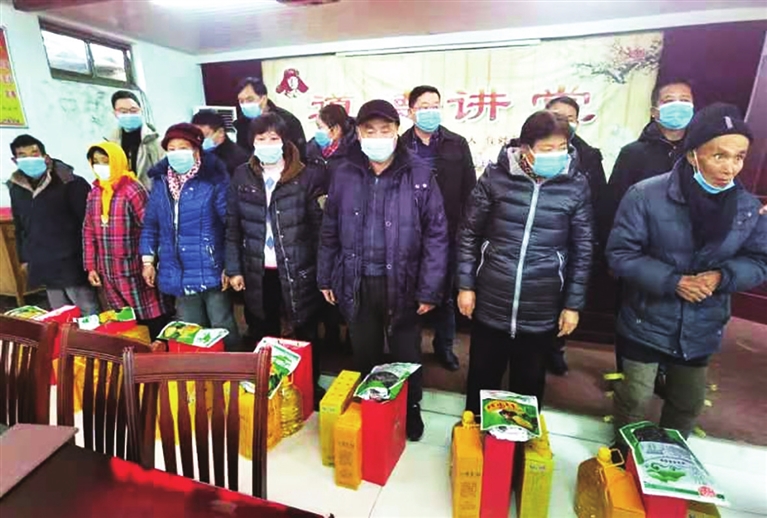 27日下午,高邮市灯具厂营销员及社会爱心人士到周山镇志光村奉献爱心,为该村重病户、困难家庭、贫困学子送去食用油等年货, 并捐款17000元。图为慰问活动现场。 葛维祥 摄影报道